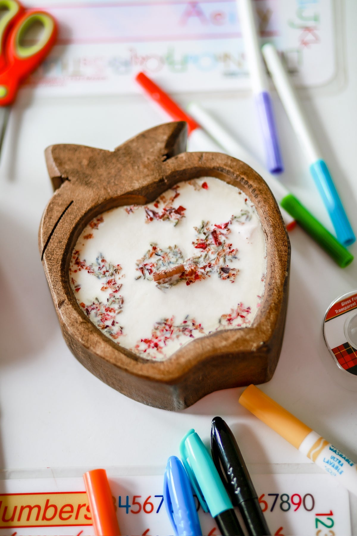The Apple Dough Bowl Candle is a 6 inch wide, 7 inch long, and 2 inch deep candle with a liquid volume of 9-11 oz. Handmade from natural materials, each bowl is uniquely rustic and beautiful, with a charming imperfection that adds to its charm. Perfect for creating a warm and cozy ambiance in any room.