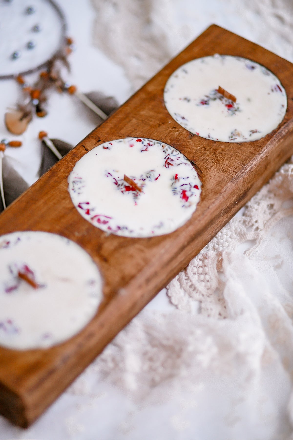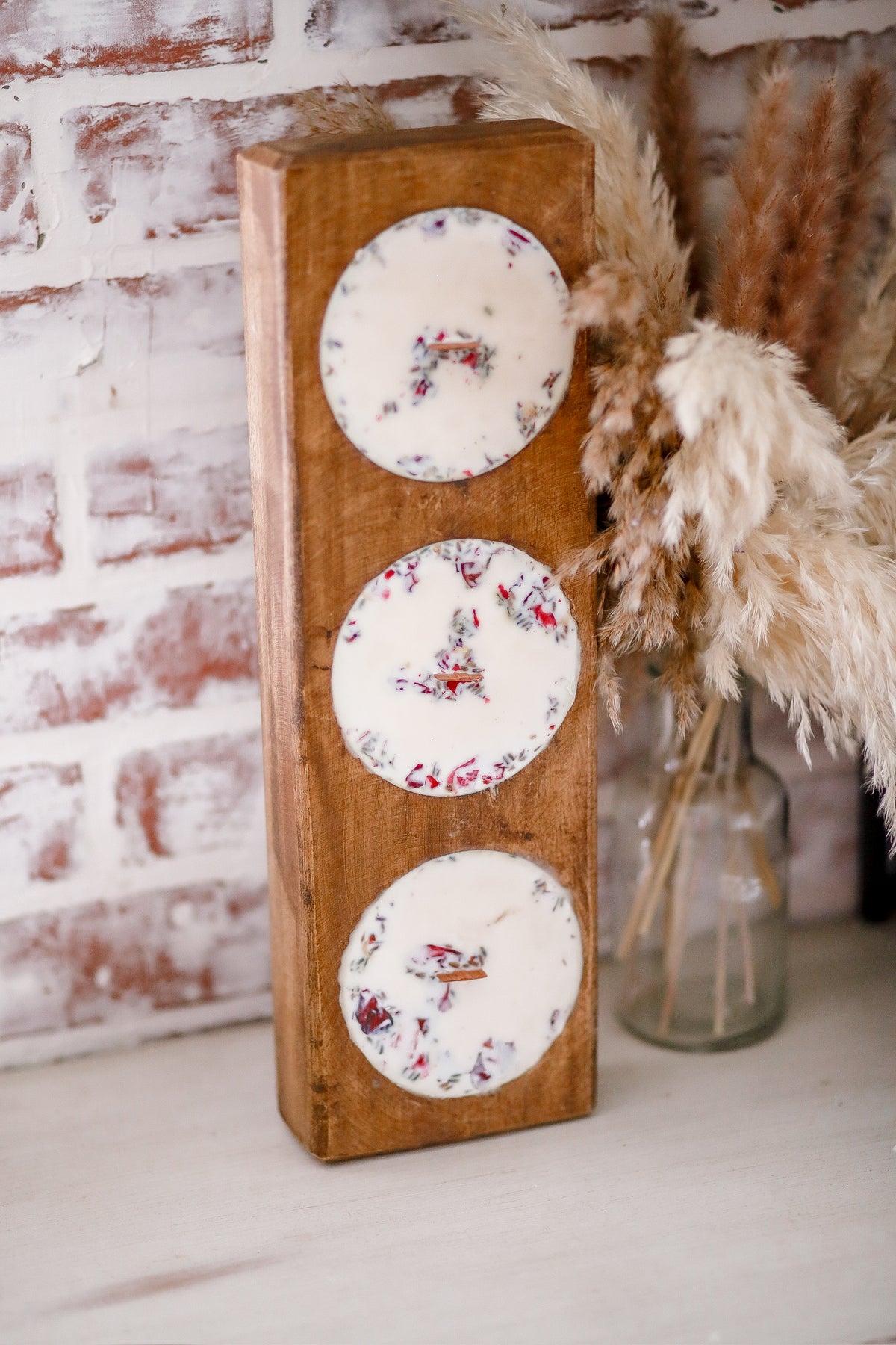 Our Double Cheese Mold Dough Bowl Candle is further accented with dried florals. These natural embellishments enhance the rustic aesthetic, transforming each candle into a standout piece in your home decor.