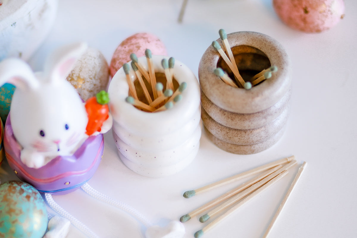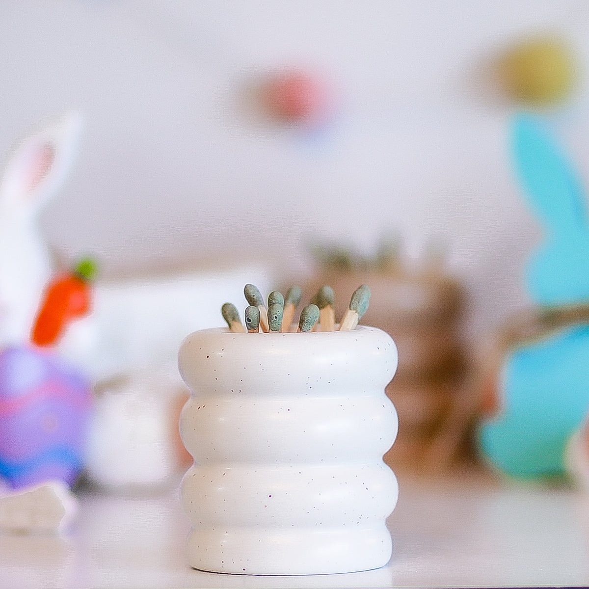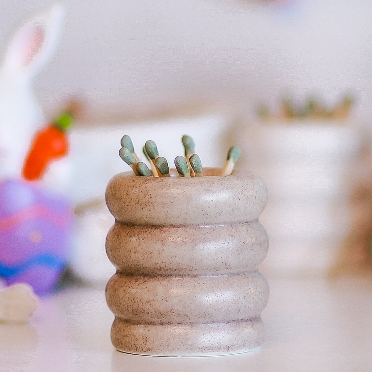 Introducing the Ceramic Match Pot - the perfect accessory for your candles! With a scratcher included under the jar, these matches are functional and beautifully designed. Use it as a mini vase, incense holder, toothpick or q-tip holder! Comes with 12 sage green tip matches. Size: 2.5" x 2".