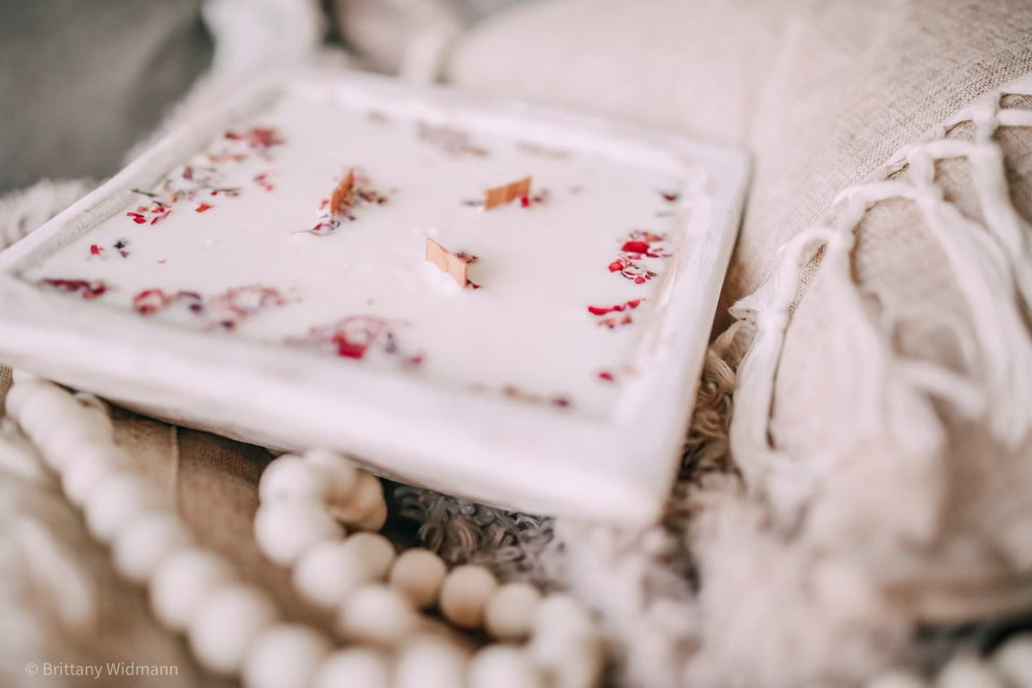 Our Farmhouse Square Dough Bowl Candle is distinguished by the elegant touch of dried florals. These natural accents enhance the rustic aesthetic, making each candle an eye-catching piece in your home decor.
